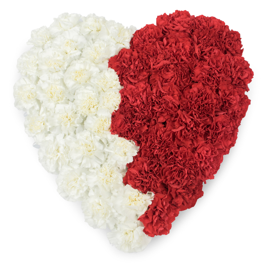 Express your deepest sentiments with our Beautiful Red and White Carnations Heart Bouquet. This elegant arrangement combines a vibrant blend of red and white carnations, artfully arranged into a heart shape to symbolize love and sympathy.